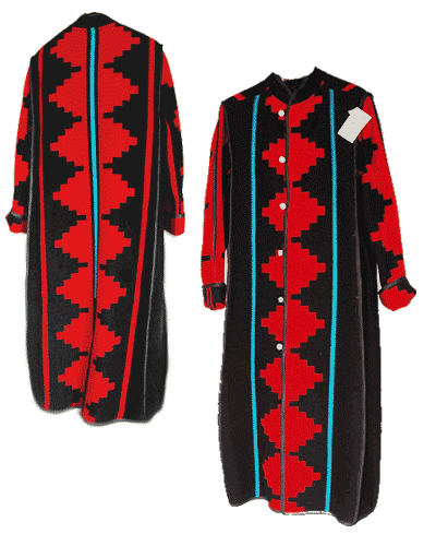 We offer the Drover's Coat in solid color wool, Point Blanket wool or Fleece, with doe-suede cloth lining; also in solid color Denim with patterned Chamois Flannel or Cotton Print lining. Solid color wool choices are Black, Dark Navy, True Red, or Dark Brown. Point Blanket color choices are Classic Hudson's Bay (cream with multicolor border stripes), Burgundy (with black border stripe), or Navy (with black border stripe). Denim color choices are Black, Red, Tan, Green, Burgundy, Navy, Medium Blue, or Gray.